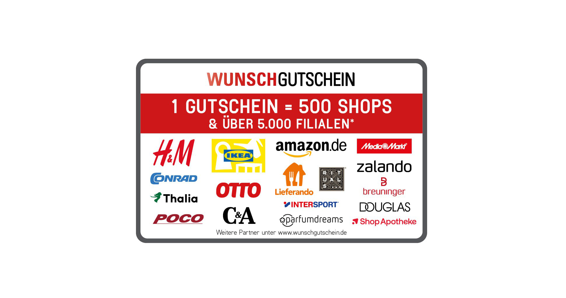 Mit dem Wunschgutschein erhältst du nicht nur einen Gutschein, sondern über 500 Möglichkeiten dich zu belohnen. Ob Mode, Beauty, Reisen, Elektronik und mehr – der Wunschgutschein ist in Partnergutscheine von beliebten Marken wie Amazon, Zalando, Douglas, MediaMarkt, H&M und in über 5.000 Filialen einlösbar. Die Gutscheine sind drei Jahre lang gültig, beginnend ab dem Ende des Jahres, in dem du die Geschenkkarte erhalten hast. So bleibt dir genügend Zeit, um entspannt tolle Artikel zu shoppen.